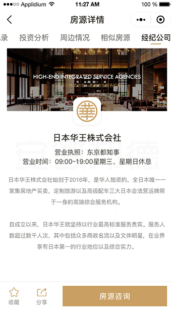 日本华王株式会社始创于2016年,是华人独资的,全日本唯一一家集房地产买卖,定制旅游以及高级配车三大日本合法营运牌照于一身的高端综合服务机构。邦德开发为客户提供微信小程序效果图设计,小程序接口开发,微信小程序开发和数据库开发,每位客户均按照需求提供定制设计开发,签订合同,分期付款,并提供完善的售后技术支持。以下微信小程序案例效果图我们为了防盗打了水印,微信小程序案例可提供演示和详细功能开发清单,详细内容可以咨询邦德开发客服人员微信!